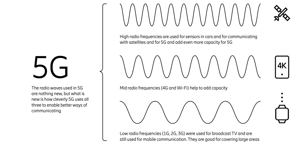 Mobile networks use radio waves to communicate, radio waves have different frequencies and 5G uses three different ranges of radio frequency – low, mid and high.