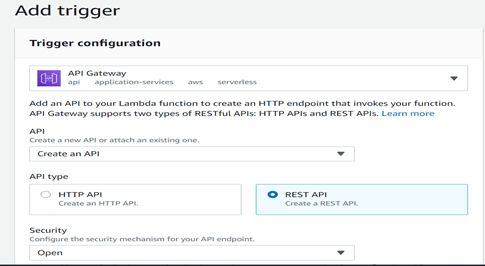 6. Go to Designer section to create API gateway endpoint. Click to +Add trigger and configure: