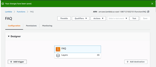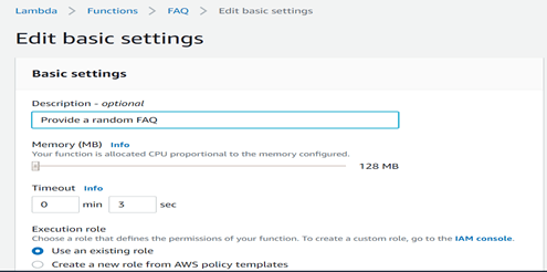 5. Select Basic settings, for description, enter: Provide a random FAQ. (Here, AWS lambda functions can be triggered automatically by activities such as data updating in AWS DynamoDB database).