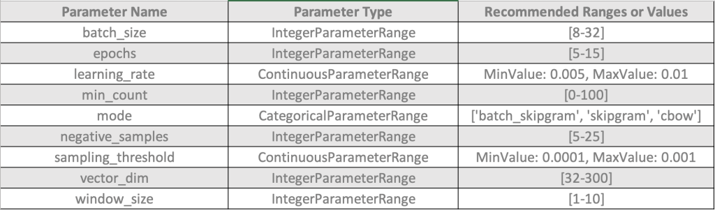 We can tune an Amazon SageMaker BlazingText Word2Vec model with the following hyperparameters. The hyperparameters that have the greatest impact on Word2Vec objective metrics are: mode, learning_rate, window_size, vector_dim, and negative_samples.