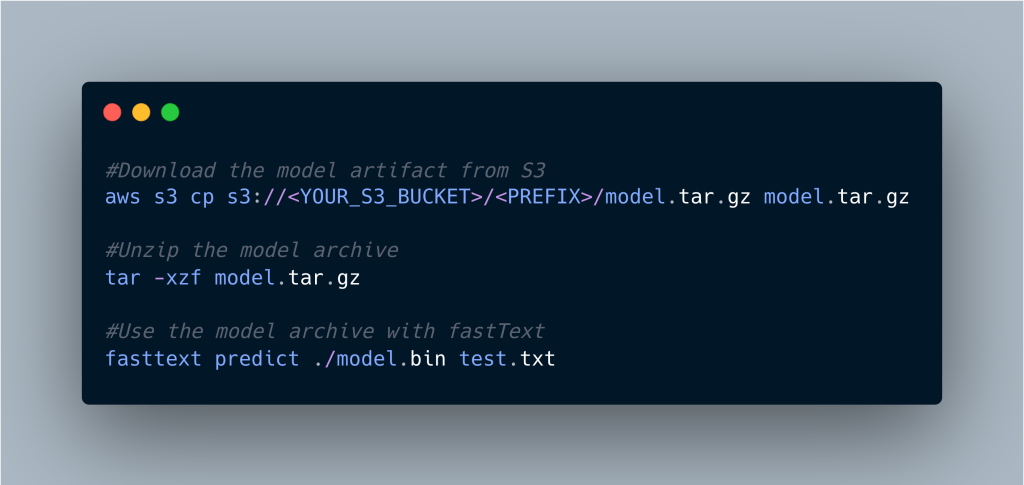 In some of the use cases, mean_rho might not be the right parameter to judge the Word2vec model performance, so it’s better we calculate the model performance on our test dataset. We can locally load all the models from S3 location(generated during hyperparameter tuning) in fastText model and see how the model is performing on our dataset and see what particular combination of hyperparamters are working for our use case/dataset.