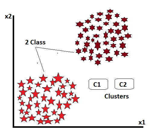 Suppose we have two classes of data, which are not target variables, and we want to divide them into clusters. Now, if we want to see from the beginning, we define the value of k at the beginning. Now that k represents how many classes we want to divide the data into, the number of classes is the k value. Here we have given the value of k as 2, which means we want to divide all this data into two classes.