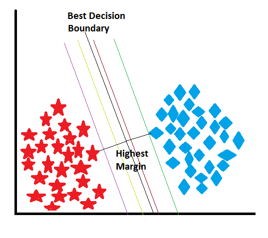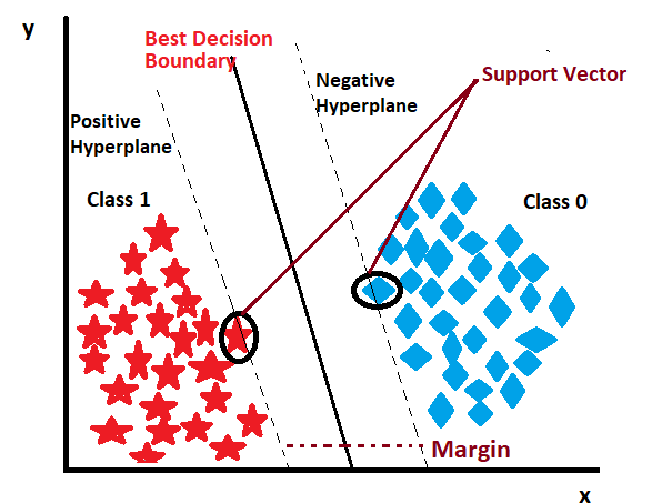 When the model receives the data, it draws multiple-decision boundaries, also known as a hyperplane, and chooses the best one. After assigning the decision boundary, the model starts to find the nearest data points for each class and draws the imaginary hyperplane from those points, which is called the support vector. The distance between the support vector and the decision boundary is known as the margin, and the model always tries to maximize the margin. Let’s explore these concepts with appropriate images and descriptions.