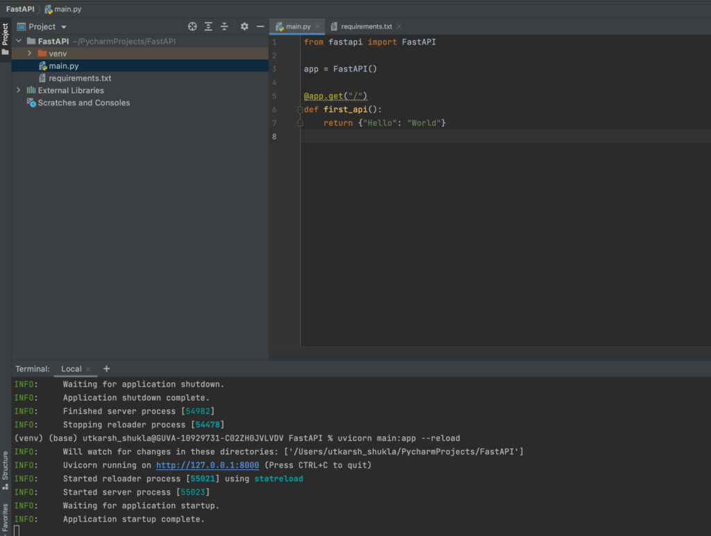 - Now, let’s run our application using the following command uvicorn main:app –reload