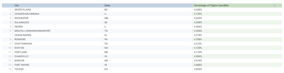 For the next visualization, the focus shifted to understanding the airports and states experiencing the highest flight cancellations, particularly for those handling over 10,000 flights. Using the Flights dataset, I created a table that displayed three key columns: Aircraft Origin City, Aircraft Origin State, and the Percentage of Flights Cancelled. By filtering for airports with more than 10,000 flights, I was able to zero in on the busiest airports and analyze their cancellation rates. Sorting the data in descending order, I highlighted the locations with the highest cancellation percentages.