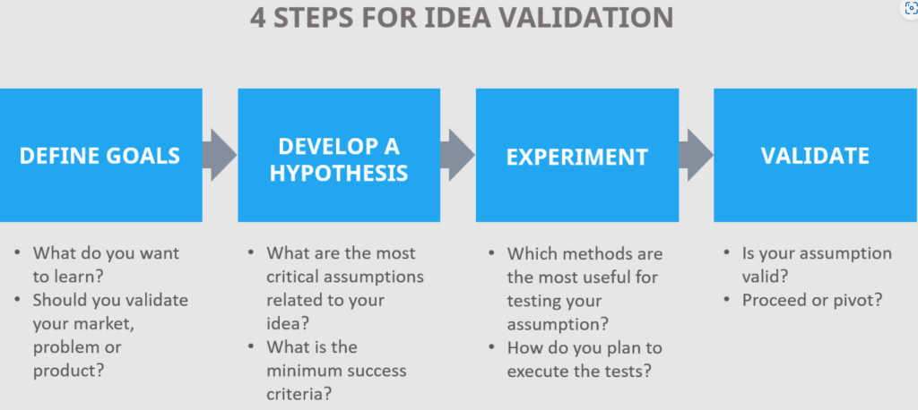 To validate an idea, entrepreneurs can conduct market research, surveys, and focus groups to gather feedback from potential customers. They can also build a minimum viable product (MVP) to test the idea and gather feedback from early adopters. The goal is to make sure that the idea has a viable market and a clear path to profitability.