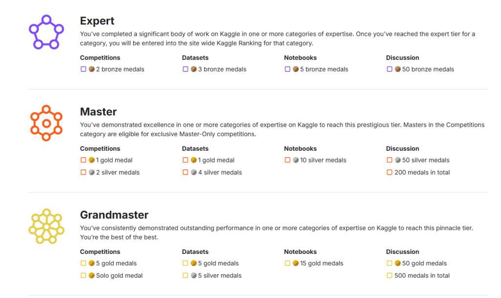 Detailed Criteria for Becoming a Kaggle Master: Becoming a Kaggle Master involves achieving a specific set of criteria established by Kaggle’s tiered performance system. The journey starts at the Novice level and progresses through Contributor, Expert, and then Master, based on the accumulation of medals from competition participation.