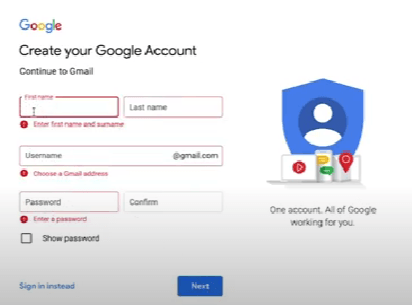 For example: When we are creating a new google account and if we don’t fill anything and just go to next, it will throw us an error and shows the required field in red colour and also gives suggestions like” enter first name and surname”; Choose a gmail address; Enter a password.