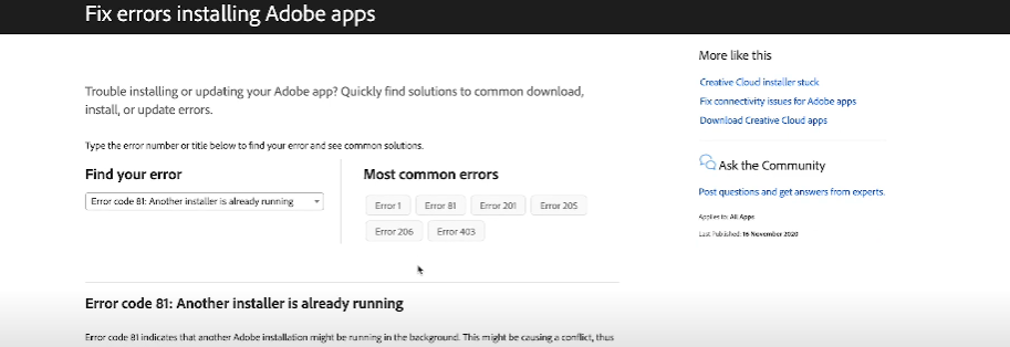 For example, in adobe’s website, if we have any trouble in installing any adobe app, then it will give us a drop-down for “Find your error”. On selection of type of error , it will provide a description of that error along with the possible solutions. Also, it provides us with the list of most common error codes to save our time more.