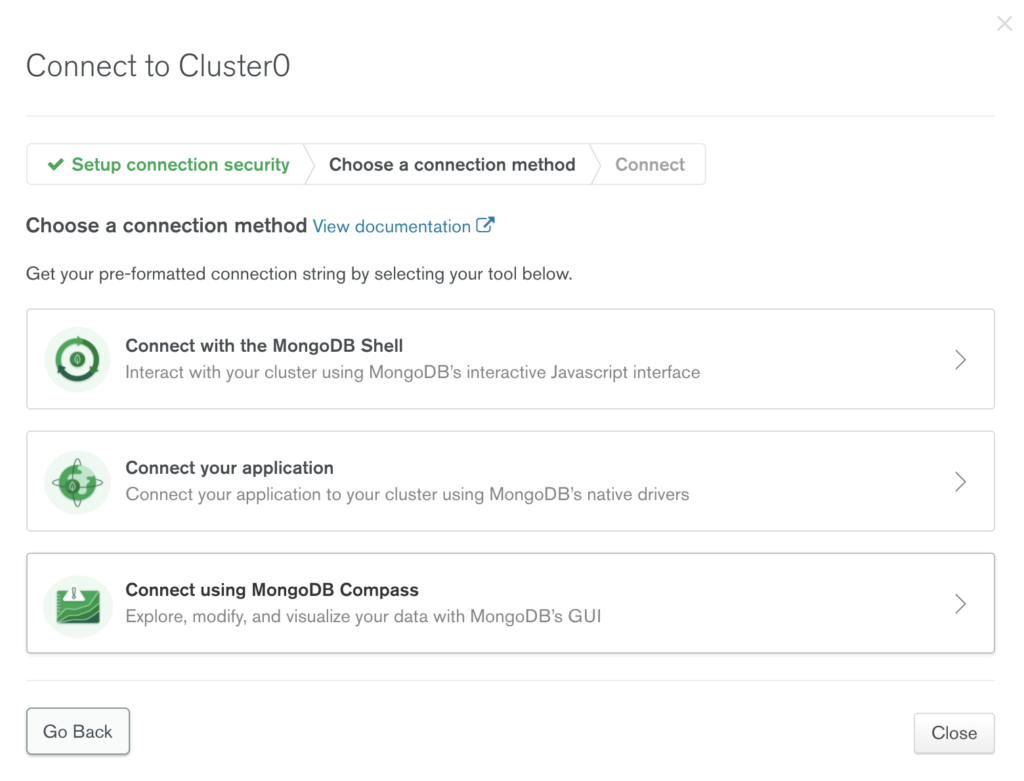 - For finding the connection string to the cluster you can click on the connect button and select the application to get your link.