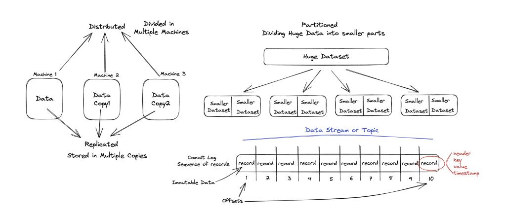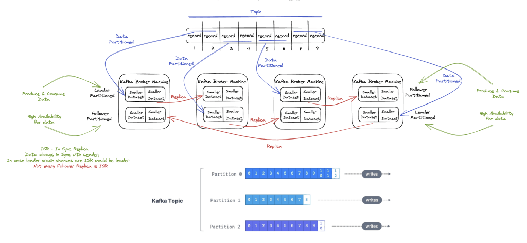 Kafka broker(server) distributes data into multiple machines, even makes the copies(Replicas) of data in different machine, so that if one machine will down, still data can be access from replica. Below diagram illustrate the base idea which is self explanatory.
