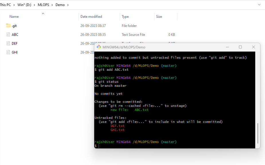 The git command is used to transfer the files from the project folder which is also known as a workspace to the repository (.git folder). The files in the workspace are also known as files are untracked files and our first job is to transfer the files from un-tracking to track using git command.