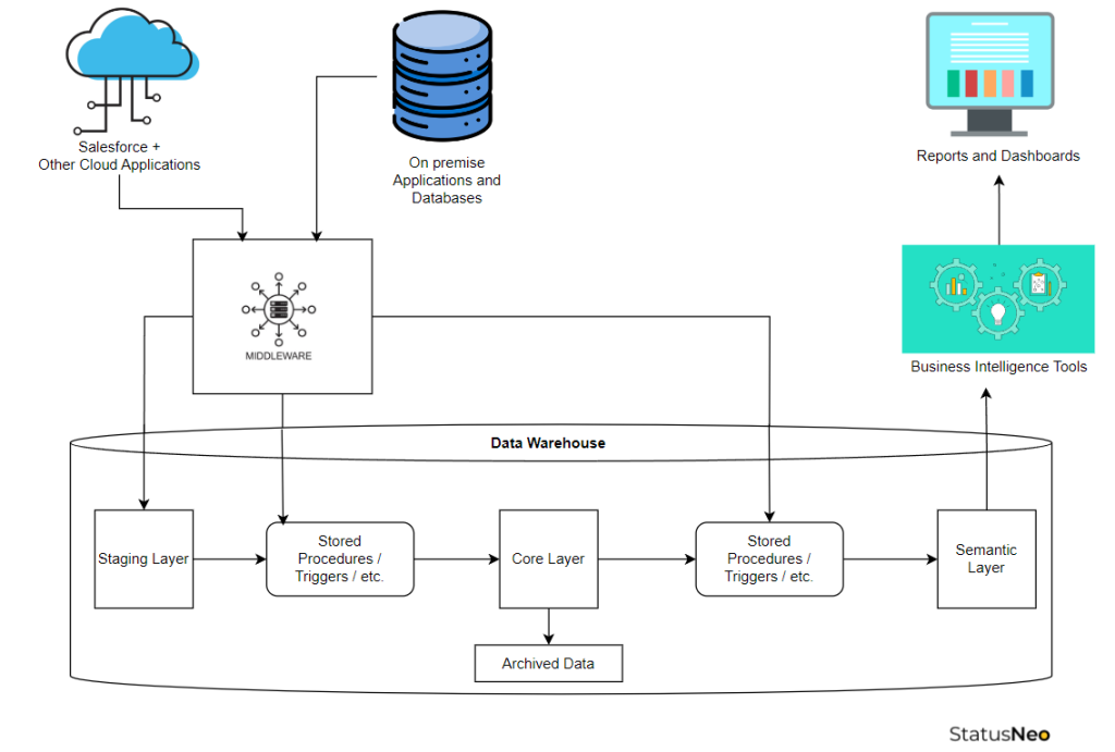 Salesforce, middleware, and data warehousing work together to help businesses get the most out of their customer data. Middleware connects Salesforce to other systems, keeping data consistent and up-to-date. Data warehousing stores data in a central location for analysis and reporting, allowing businesses to make informed decisions. By using these technologies together, businesses can become more efficient, flexible, and competitive in today’s data-driven world.