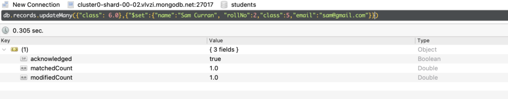 - In update query, we will pass the matching phase in the first part, and the updated record in the next.