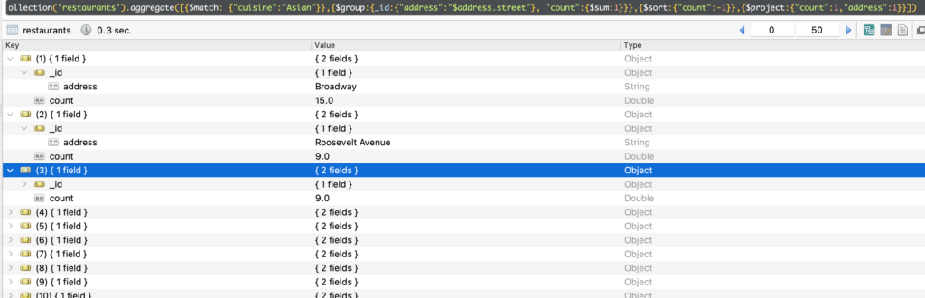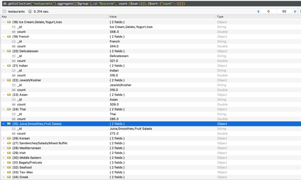- Different types of aggregation fields that are available can be seen from here – https://docs.mongodb.com/manual/meta/aggregation-quick-reference/