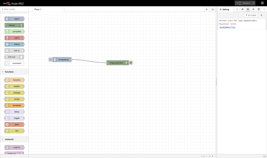 - Click on the deploy button, then click on the left side of the inject node.