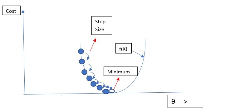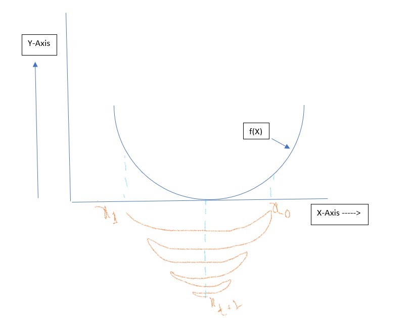 For example suppose Xt is first input for the Objective Function. Based on the output we get we try to move either right direction or left direction of Xt on X-axis to find an optimal solution. Let’s suppose the next input value would be Xt+1.We do this iteratively till we find an optimal value for X which gives us minimum error in our Objective function. One important observation in the graph is that the slope changes its sign from positive to negative at minima. As we move closer to the minima, the slope reduces.