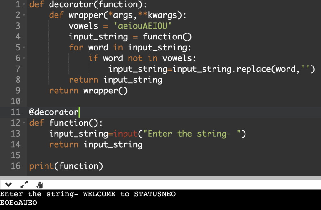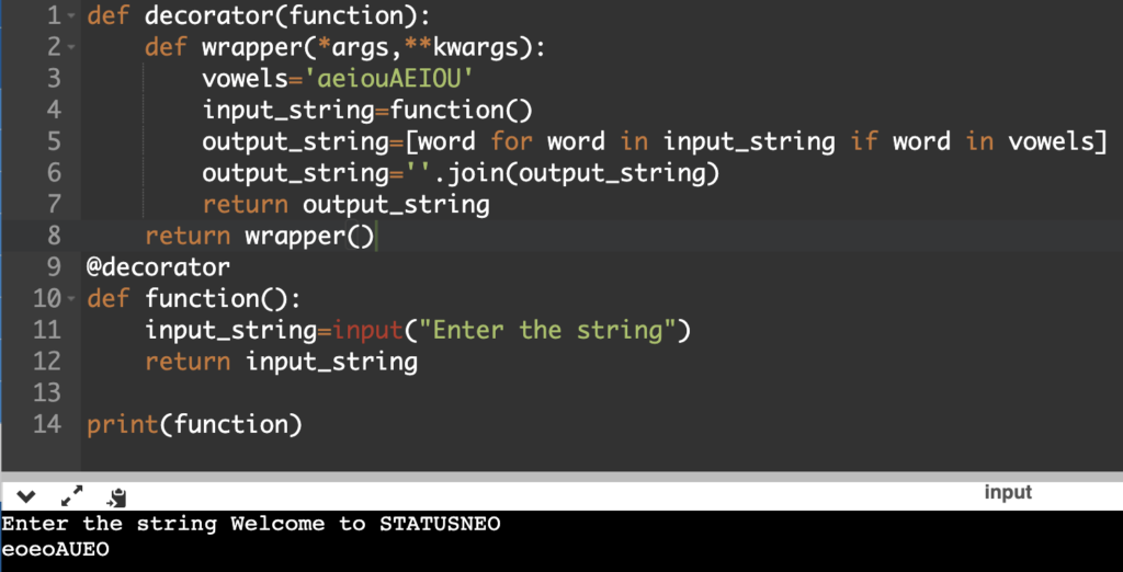 You are asked to write a program to demonstrate the usage of decorators in which the user will provide input and you are required to create a function that will be decorated in a way such that only vowels in the input are returned.