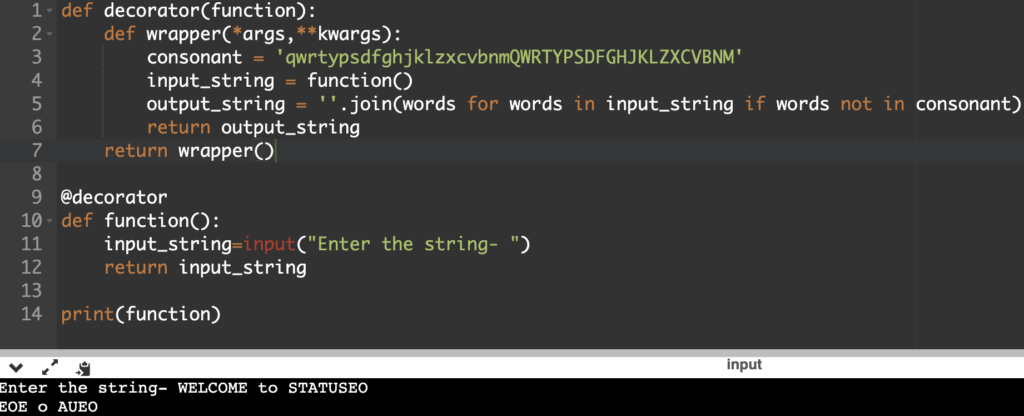 • In the end, We will use list comprehension inside join and will return the output string comparing with the consonants.