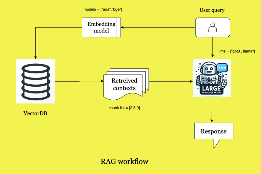 This query will be converted into vectors using any embedding model. Few examples are shown in the diagram.Now here let’s take a break and understand the vectorDB part first. VectorDB are used to have permanent access to contexts for our LLM to help him answer the user questions. Let’s say we have a pdf report of climate impact on the world. We will save this pdf report in the vectorDB.We will break down the pdf into smaller chunks and then vectorize these chunks using any embedding model and then store these vector chunks in the vectorDB.
