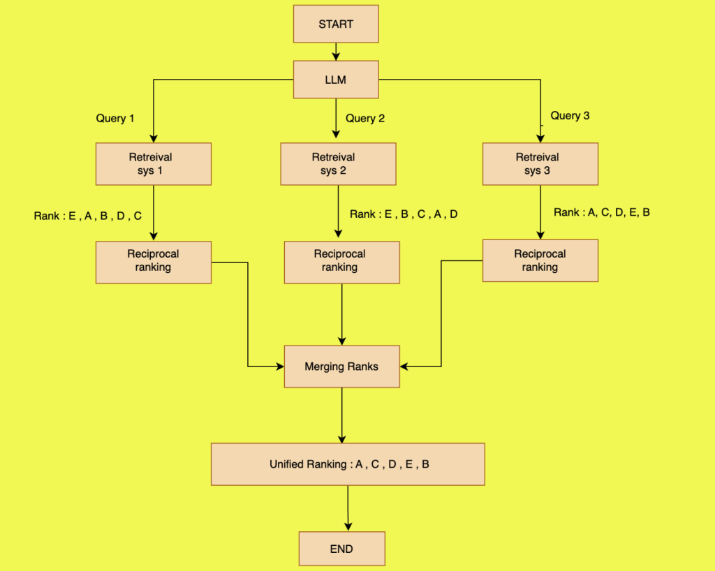 In RAG FUSION , instead of one query , multiple queries are generated.As shown in the figure above,we have three queries generated.For each query , retrieval operation is performed and the results are ranked as per the similarity with the query. As we can see , we have ranking of the documents for each retrieval query.Then we need to merge these results together to give us our final rank.This merging is done using Reciprocal rank fusion algorithm.