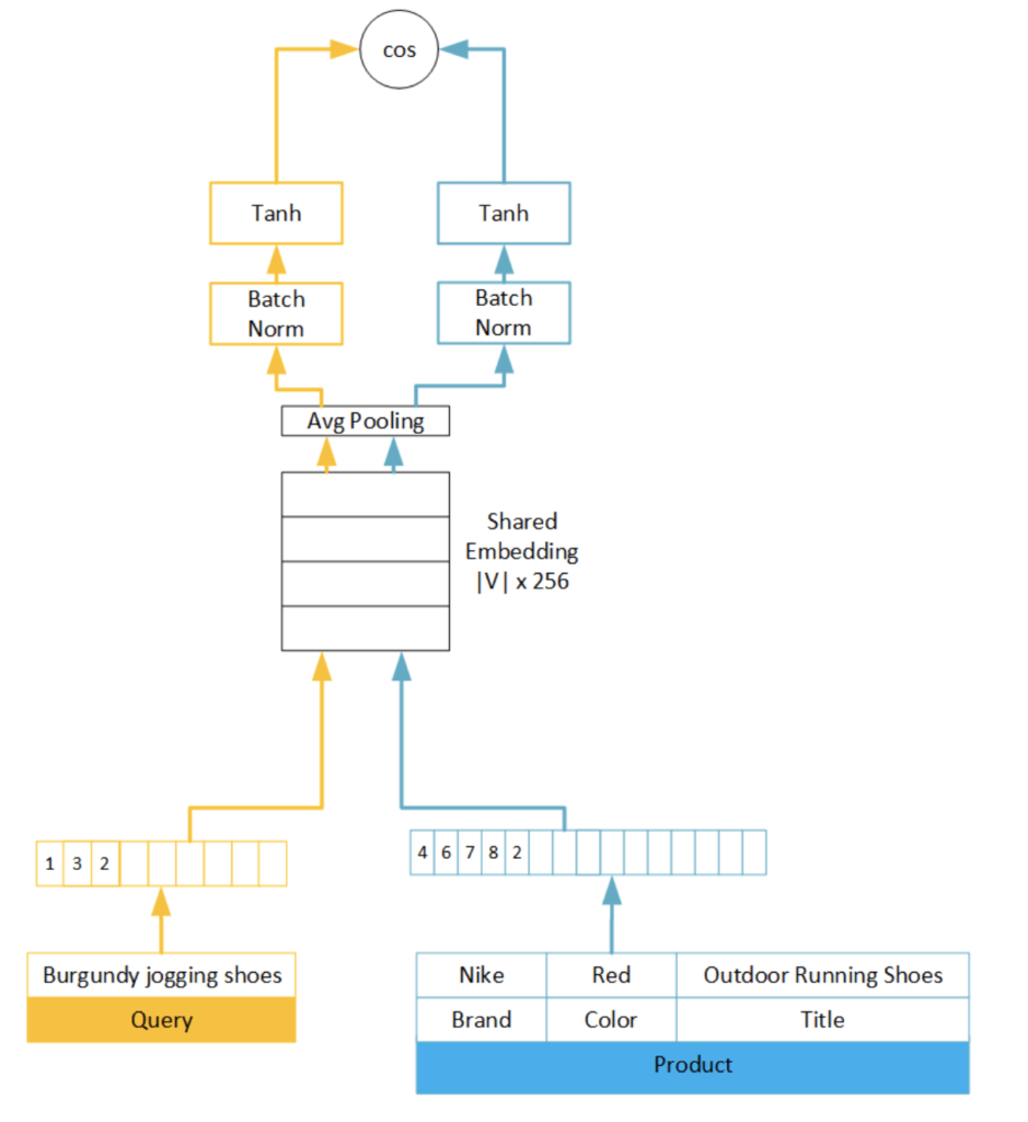 - From the below diagram we can see the Illustration of neural network architecture used for semantic search in Amazon.