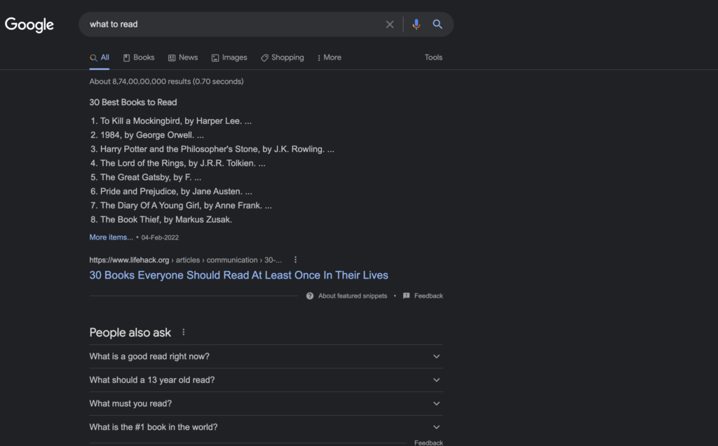 - In the above example, we can see that when we are searching for what to read, google search is suggesting to us the name of books.