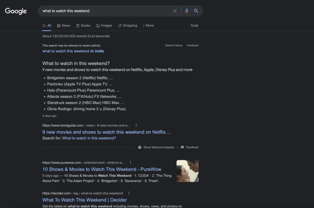 - Similarly in the above image, we can see the results of what to watch this weekend, is showing us the list of movies and shows.