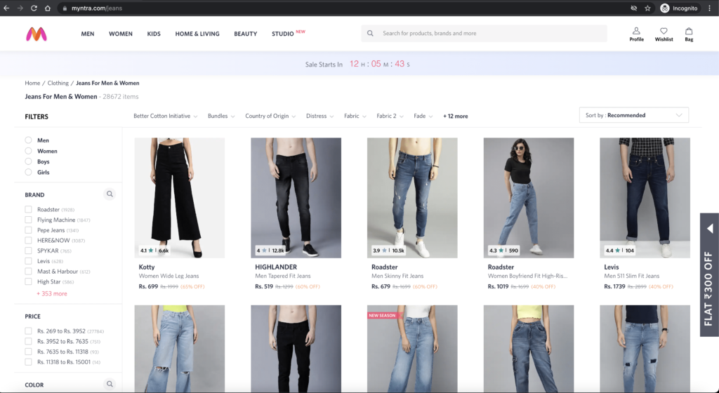 - From the above example, we can see when we are searching for jeans, it is showing us results for all types of jeans irrespective of gender.