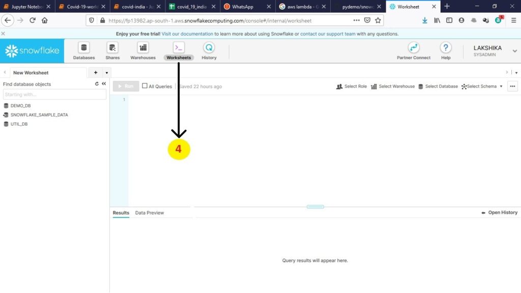 Worksheet maintains the result of each query executed in your current session and detailed information such as duration and starts time. Results can be downloaded in a text format.