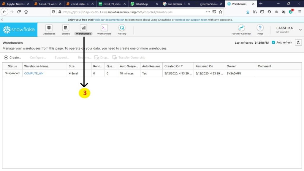 - Suspend and resume warehouse tab as snowflake only charges the cost of computation when we are using it