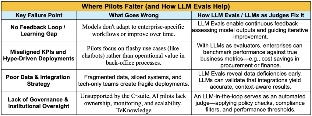 Investor concerns are understandable, but it’s the C-suite who must stay grounded, acknowledge the risks, and guide the organization forward. The truth is: GenAI pilots aren’t failing because the technology is immature. They’re failing because organizations aren’t evaluating and deploying them in ways that lead to sustainable, scalable outcomes.