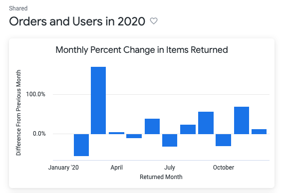 To dive deeper into post-purchase trends, I focused on analyzing the fluctuation in returned items over the course of 2020. Leveraging Looker’s advanced table calculations, I first filtered the dataset to include only returns made during the 2020 calendar year. Then, using the offset() function, I calculated how the number of returned items changed from one month to the next—providing a dynamic view of customer return behavior. A secondary calculation helped convert this difference into a percentage, making the trend easily interpretable. The results were visualized through a column chart that clearly highlighted month-over-month variations. By hiding the base count fields from the visual, the final chart kept the focus on percentage change, offering quick insight into seasonal spikes or unusual return rates. This visualization was then saved to a newly created dashboard titled “Orders and Users in 2020,” offering stakeholders a data-backed view into return patterns and their potential business impact.