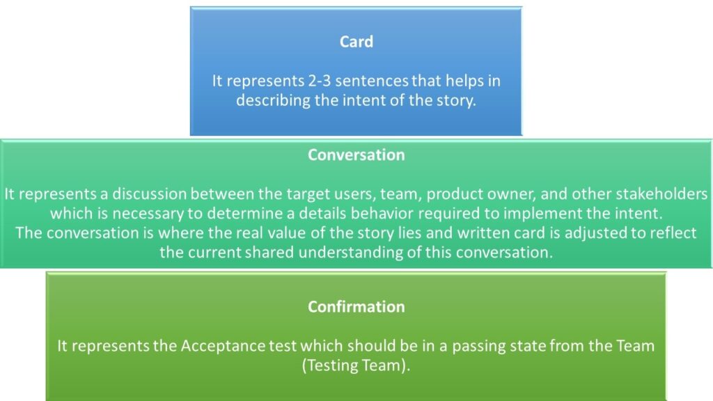 Ron Jeffries, one of the creators of XP has given 3 primary components to user stories – Card, Conversation, and Confirmation to describe 3 elements of User stories