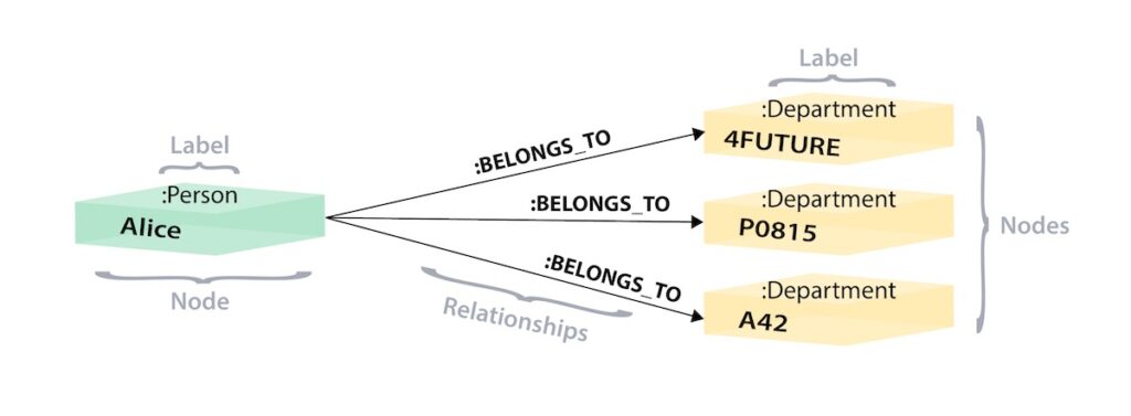 In the above graph version, we have a single node for Alice with a label of Person. Alice belongs to 3 different departments, so we create a node for each one and with a label of Department. To find out which departments Alice belongs to, we would search the graph for Alice’s node, then traverse all of the BELONGS_TO relationships from Alice to find the Department nodes she is connected to. That’s all we need – a single hop with no lookups involved.