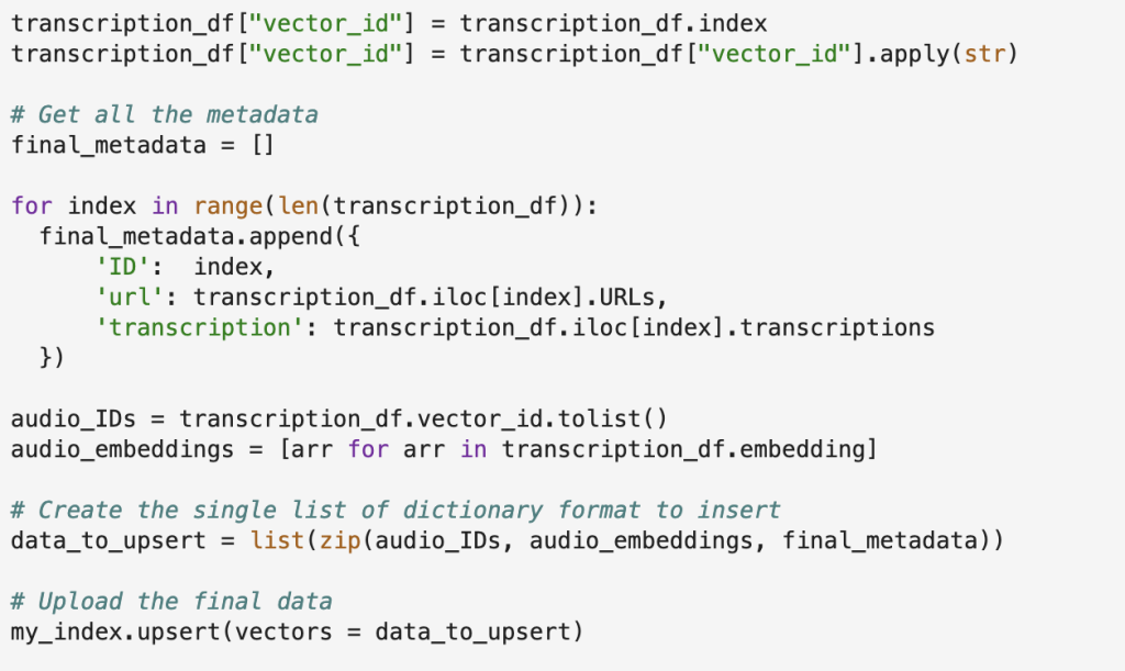 d) Pinecone vector storage with metadata: We will create an index in Pinecone and initialize it then upsert our metadata and embeddings into the index of Pinecone.